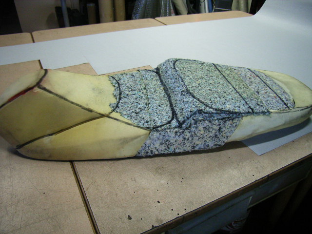 ウレタンを張り合わせてシート形状を作成して縫い目のラインを決めマジックでラインを書き入れます。