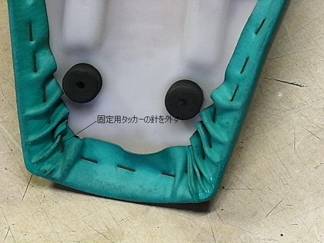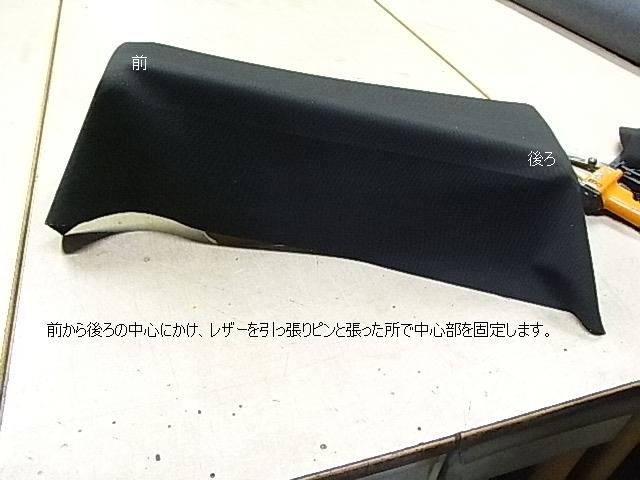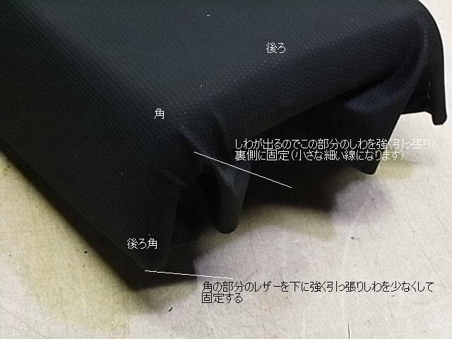 前側と横のしわのレザーを引っ張って裏に固定しますが、少しずつ