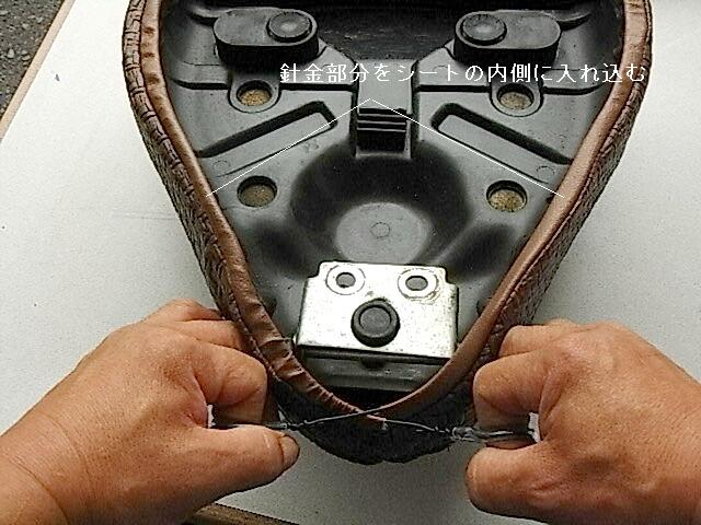 最初にシートかぶせて針金(ビニールパイプ巻き)の部分を左右にひっぱると針金の部分のレザーが収縮しぴったりと外れません。