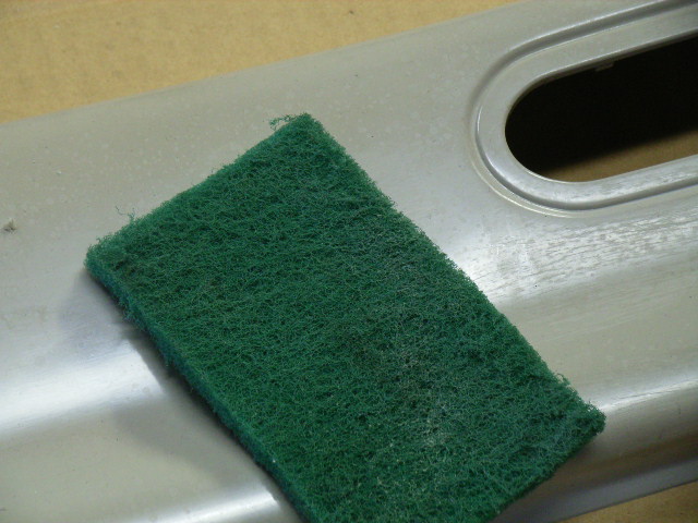 下地作業として、画像のグリーンのようなスコッチブライト(研磨用 ホームセンターで購入可能)などで、傷を付けます。