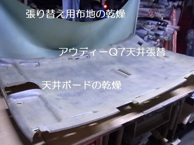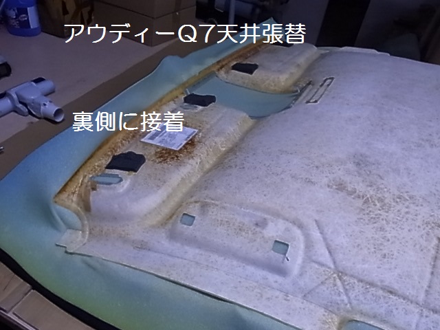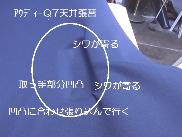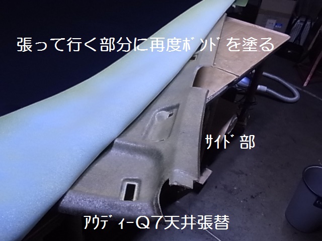 中心部分凹凸を張り終えたら今度は外側に向けて再度ボンドを塗り張って行きます、この時は下塗りで天井と、布地にボンドが塗ってありますので、どちらかにボンドを塗れば接着出来ます