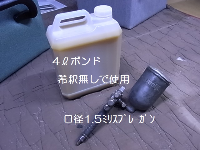 大きな天井、凹凸の多い天井などは、缶スプレーではコスパが悪いし、接着も大変です、ぜひスプレーガン用ボンドをお勧め致します。今回使用したボンド量は3.5リットルでした。