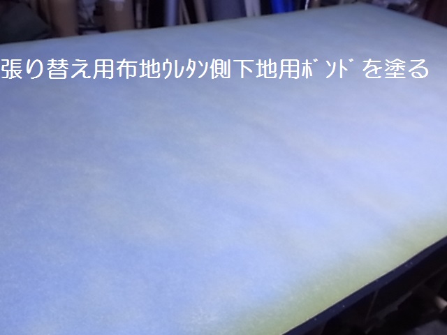 張り替え用布地にも下塗りを行います、下塗りを行う事により張替時のボンドのウレタンに浸透を防ぎ強力な接着力が生まれます