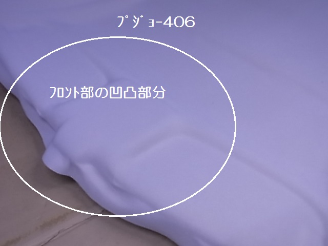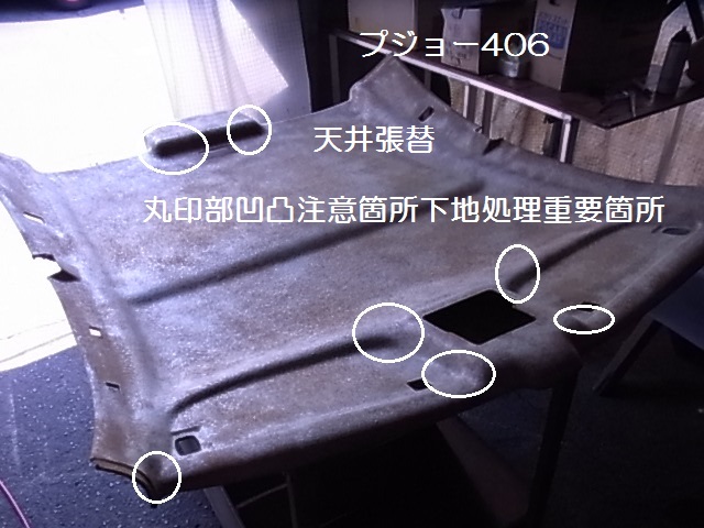 プジョー406の天井張替です、丸印部分が凹凸のある部分ですので、十分に下処理を行う事で接着不良は防げます。