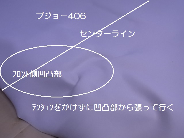406の布地は起毛タイプです、この布地はあまり伸びが無い為、無理に伸ばすと後で剥がれの原因となりますので気をつけましょう