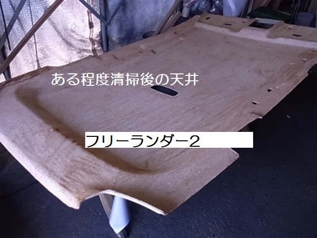 フリーランダーの天井、純正布地と劣化したウレタンを取り除いた状態、ここから下地を仕上げて行きます。