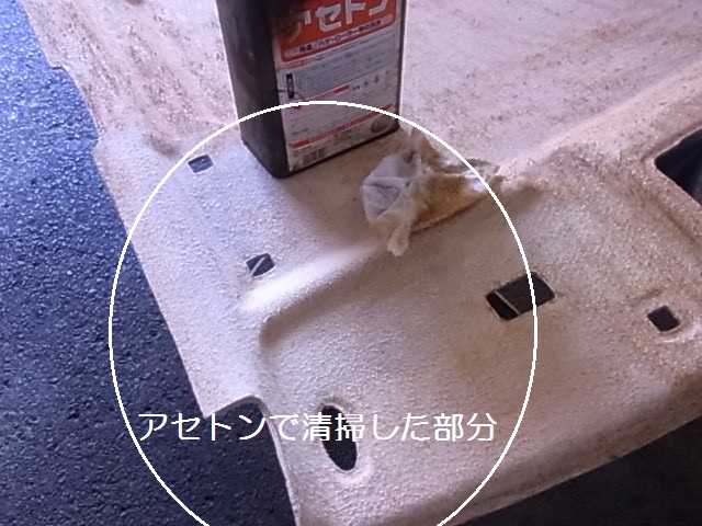 アセトンをタオルウエスを使用して丁寧に溶け出したウレタンをタオルウエスで取り除いて行きます、ウエスに溶け出したウレタンが染み込んで行くのが確認出来ます。