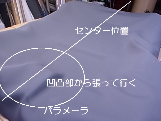 張る前に下地用ボンドは乾いている為、中心部にボンドを再度塗り布地をかぶせ位置決めをしてから中心部より外側に向かって張り込んでいきます