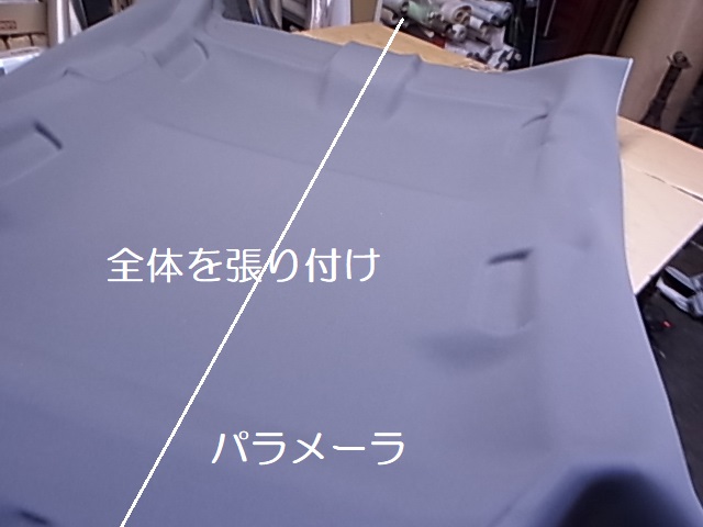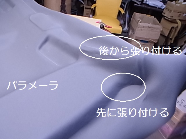 Aピラー部分は画像のように最初に手前側を張り、後で外側に布地を張って行きます。