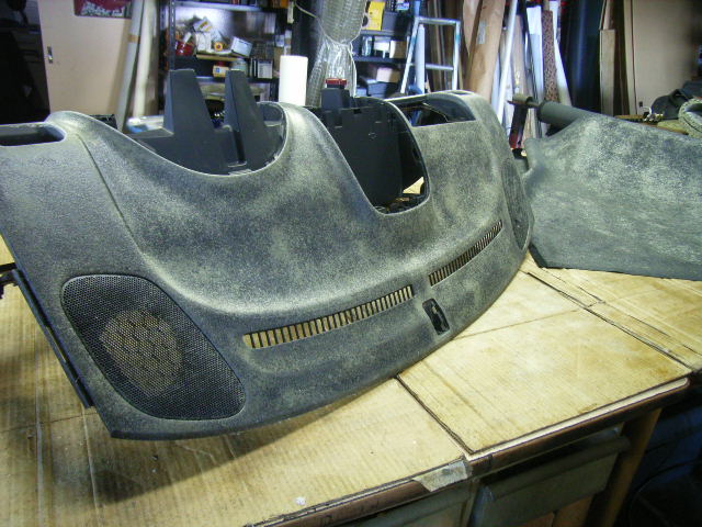 今度は接着力を十分出す為に120番ぐらいの耐水ペーパーで丁寧にダッシュボード全体をペーパー掛けいたします(足付け作業)完璧に足付けが終われば再度、シリコンオフで全体をきれいにふき取ります、この作業が完璧でないと、剥れの原因となります