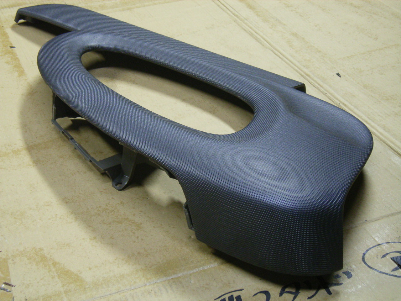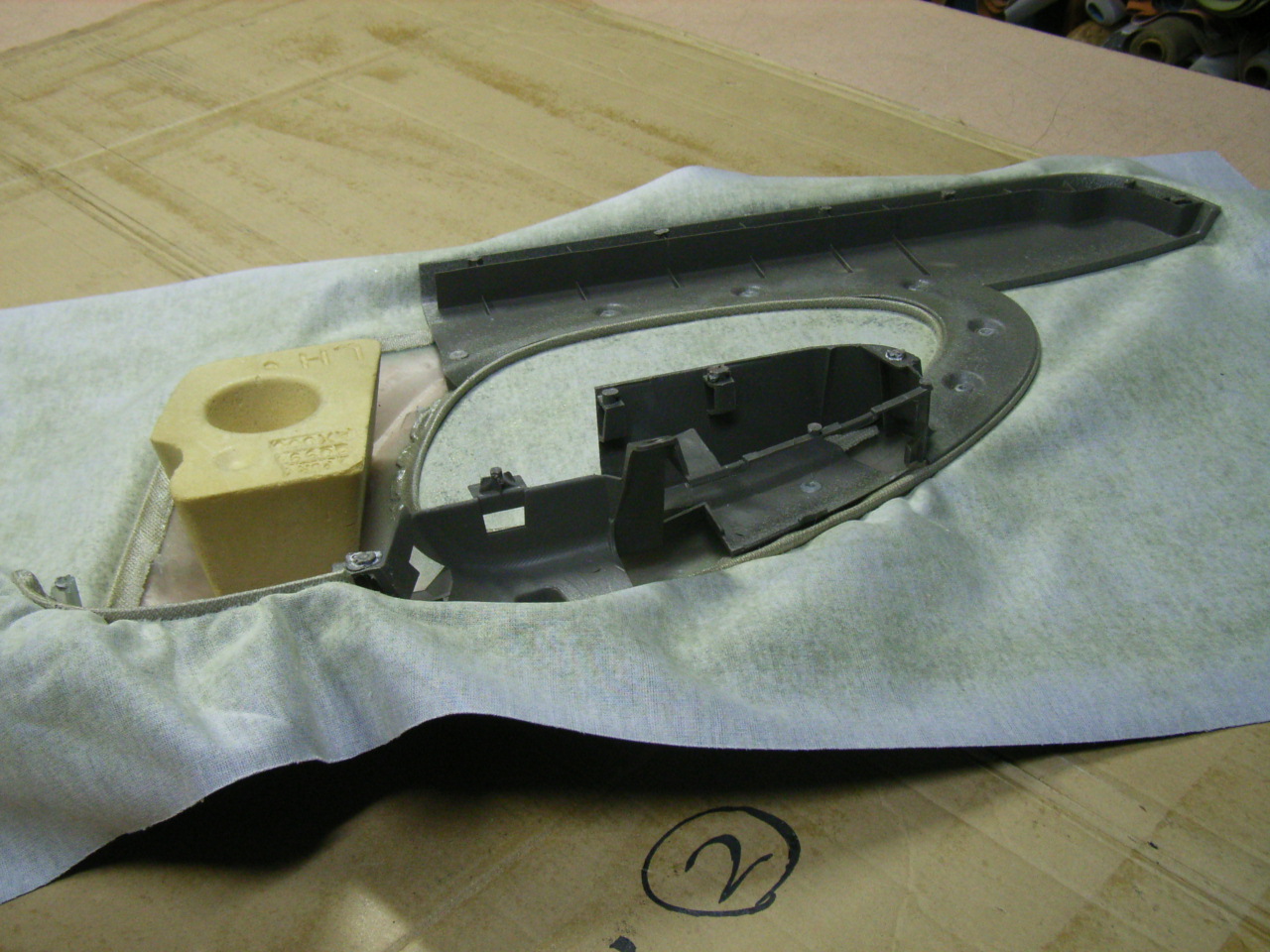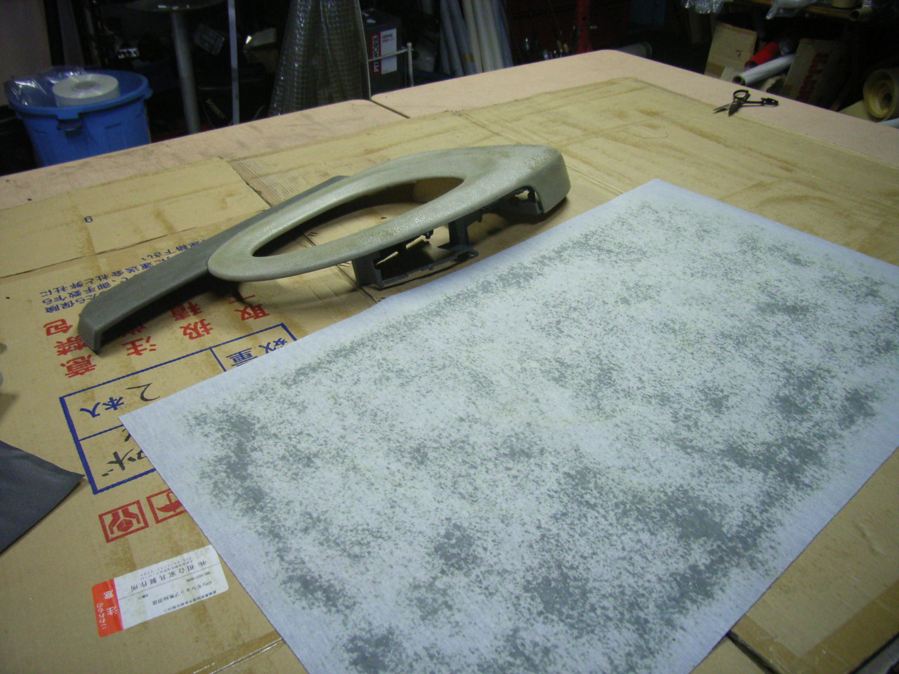 この形状は上部はわりにフラットですので簡単に張れますが、問題は下部の物入れ部分の出っ張り部分とインナーハンドルの部分の処理です、下部の物入れ部分の立ち上がりを張ると、どうしても一箇所、大きく余ってしまう部分が出ますので、そこはカットして判らない様にきれいに合わせて張り付けます、ちなみに