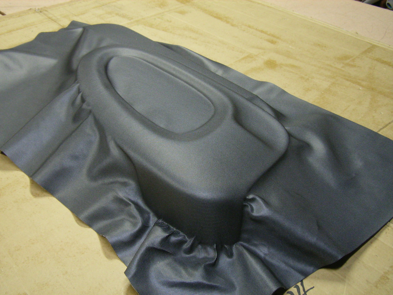 難関なのが、どこでしわを逃がすか?と言う事です、しわは、必然的に、角に寄って来ますが、角一箇所でしわを無くすのは無理なので角の周りにも、少しずつしわを分けて、必ずボンドを、再スプレーを行い、完全に接着させないと、又しわが出てしまいます、この形状がきれいに張れれば、プロ並みの腕前です^^
