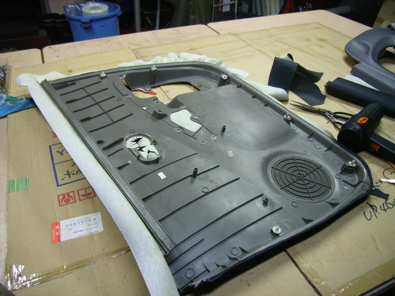 このドアはスピーカーグリルが一体式ですから、レザーを張って