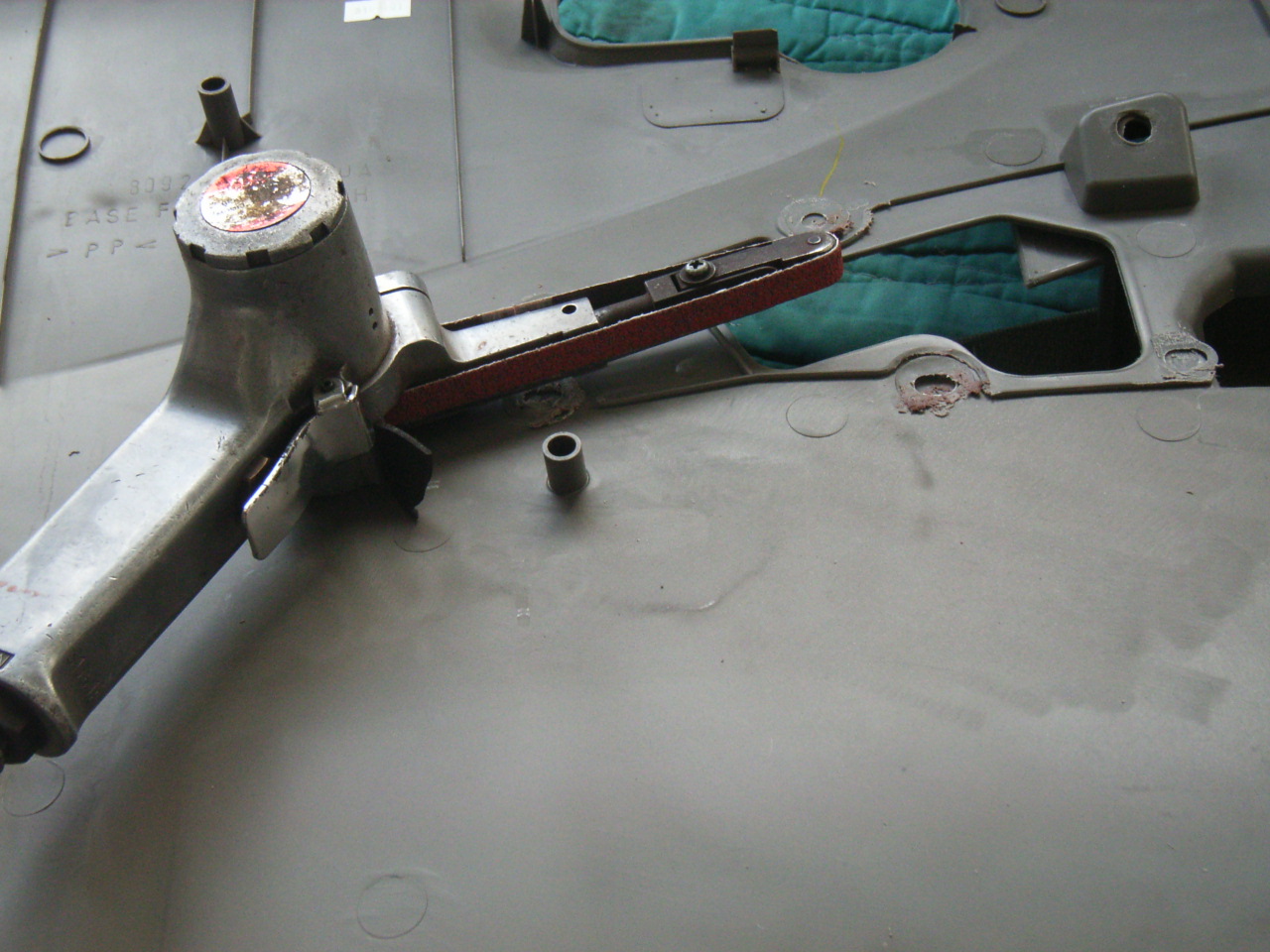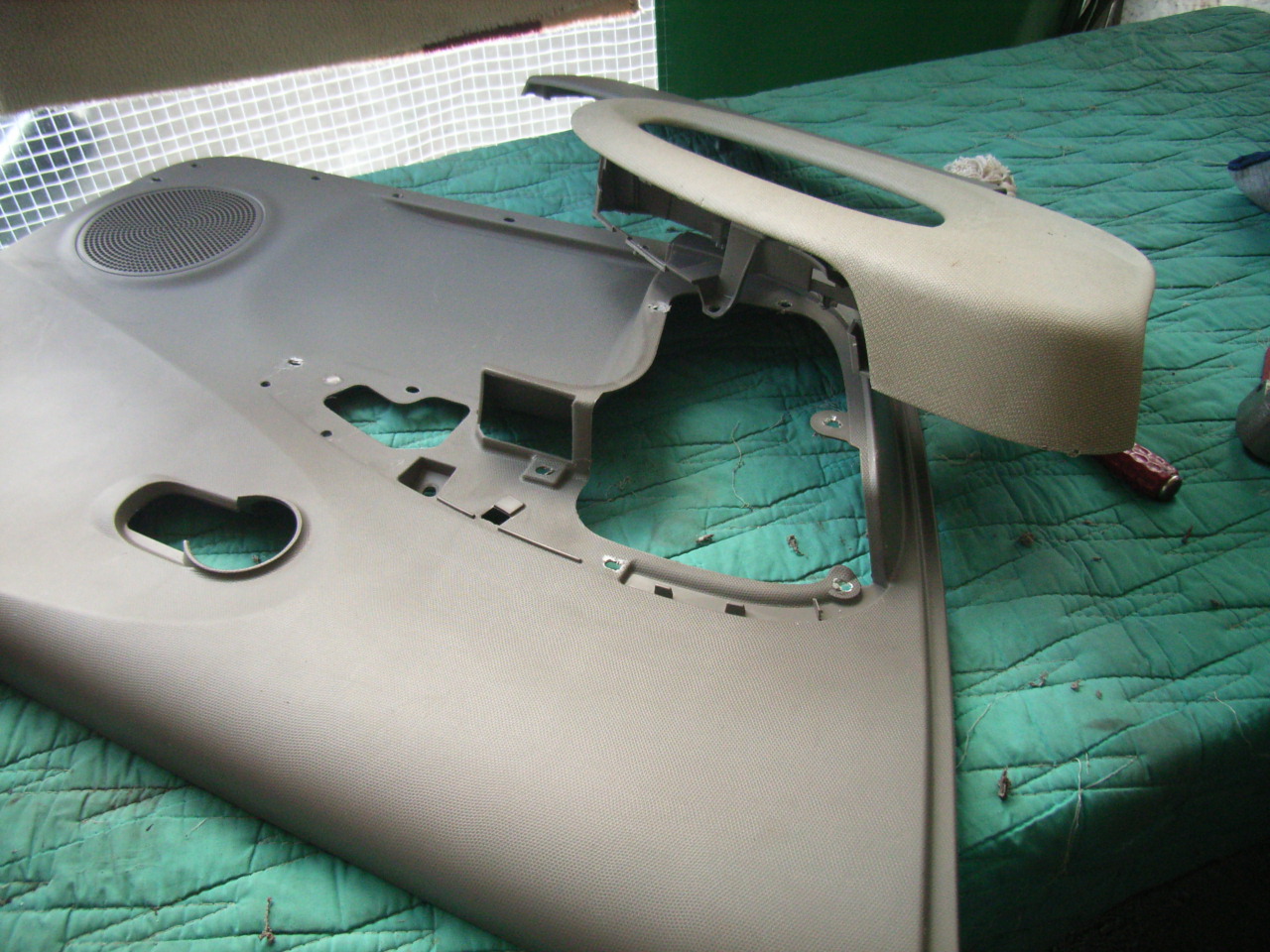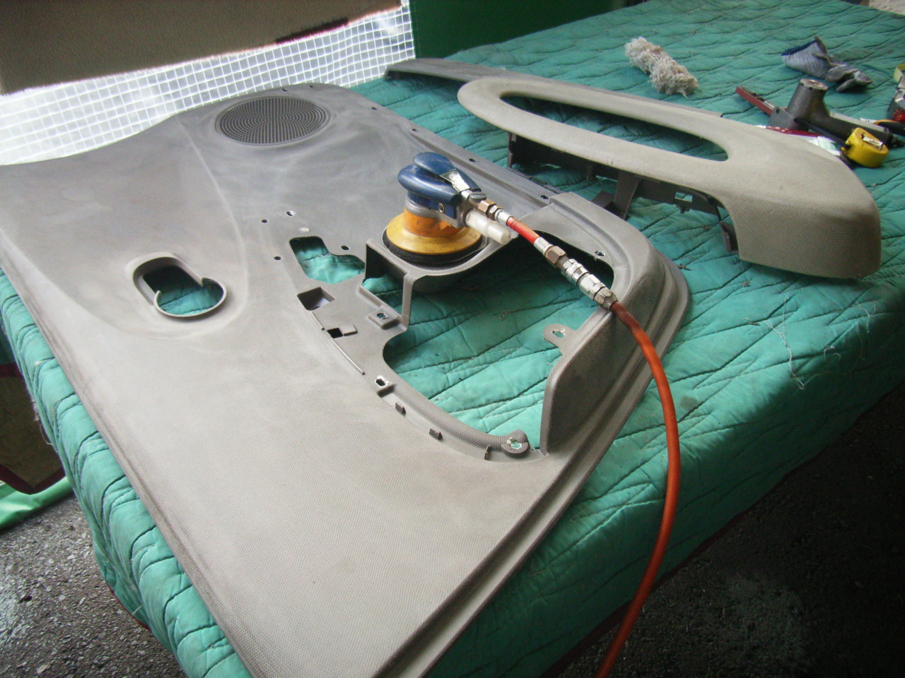 車からドアを取り外してみると、スイッチ部分と物入れ部分が本体にプラスチックを溶かし込んで固定されているのが分かりますまず、この部分を削り取らないと、分解は出来ませんので、ベルトサンダーなどを使用して、溶着部分を剥がす事から始めます。再接着は出来ませんので戻す時はタッピングを使用して固定します。