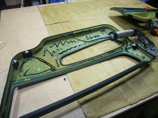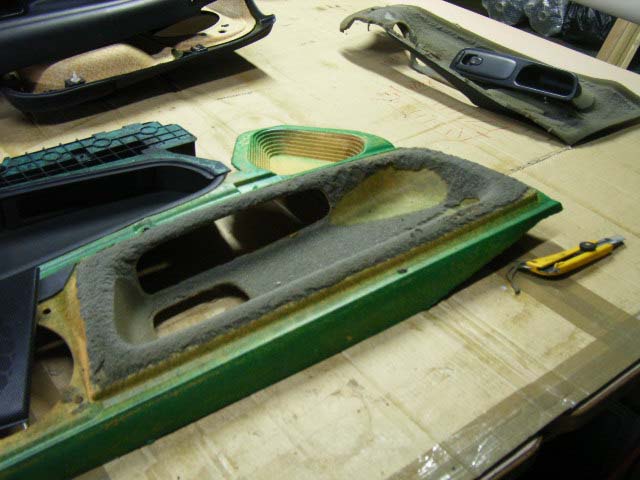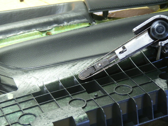 プラスチックの取って部分は裏で接着してありますから、カッターなどを利用して隙間に刃を入れ分解します。 レザーを剥がすとウレタンが残りますので、これをきれいに 取り除くのが重要です。