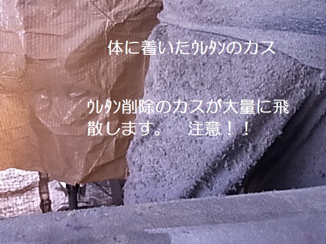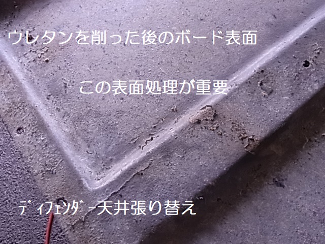 経年劣化の天井とは違い新しい天井ウレタンは色々な道具を駆使して削り落とします、又削り落とした後の処理も大変な作業です。