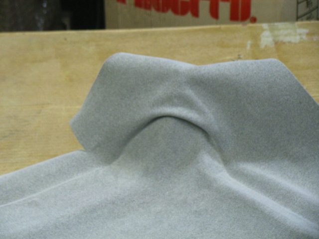 よく問い合わせがあるこのような形の部分の張り方ですが、皆さまはどちらか片方から張って行ってるようですが、この画像のように左右同じ部分を同時に張って行き、最後に真ん中を上に持ち上げ接着するときれいに張れます。
