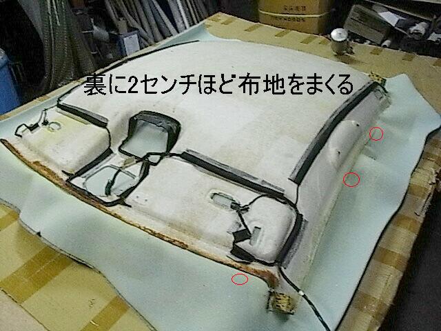天井を裏返し布地を接着する為、ボードと布地にボンドを塗ります、布地は2センチほど巻くって接着しますからボンドを塗ってからカットしても大丈夫です、赤丸部分はシワがある場所なので