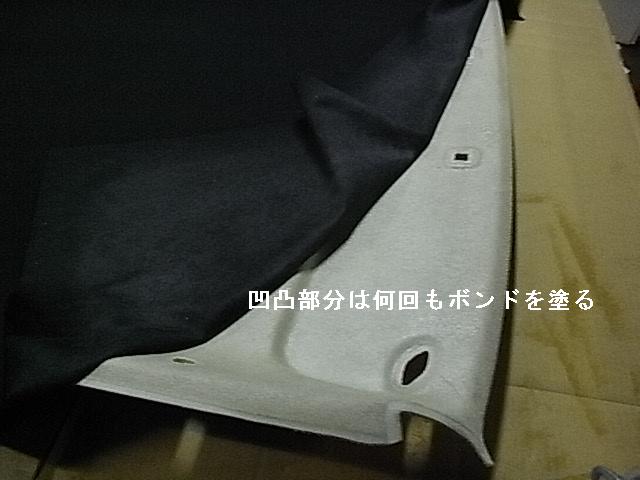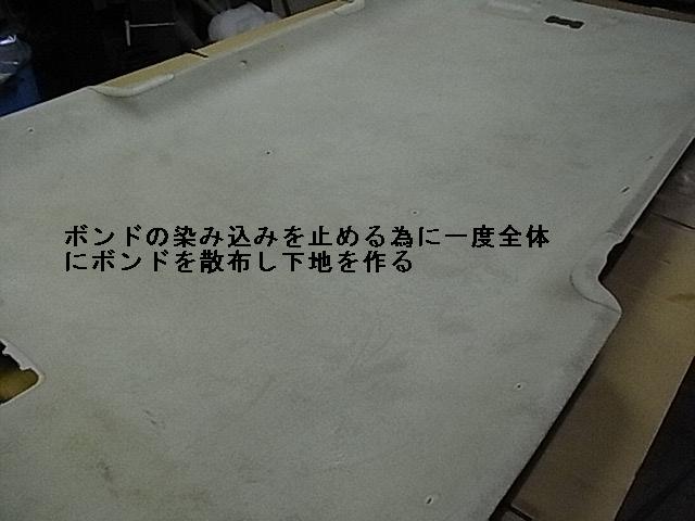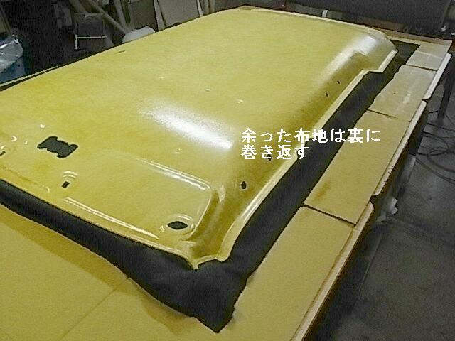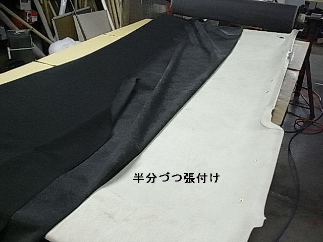 天井に塗った染み込み防止用のボンドが完全に乾燥したらもう一度天井と布地にボンドを塗り前後の中心を決め張り込んで行きます。
