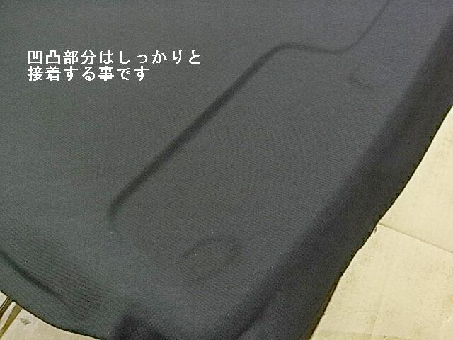 きれいに凹凸の部分が張れているのが判ります、しかしどのような布地でもこのように簡単に張れる訳ではありません”最近ご要望の多いアルカンターラなどは布地自体に伸びはありませんのでバイザー部分の凹凸、取っ手部分の凹凸などはきれいに張る事は不可能に近いと思って下さい今回使用した布地は車両用のニット内装材ですので布地自体に伸びがありきれいに張る事が可能な訳です。