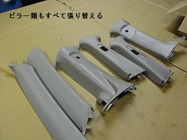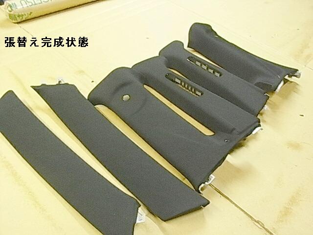 伸びの有る布地を使用するとこのようなピラーでも1枚で張り替える事が可能です、ぜひチャレンジして下さい。