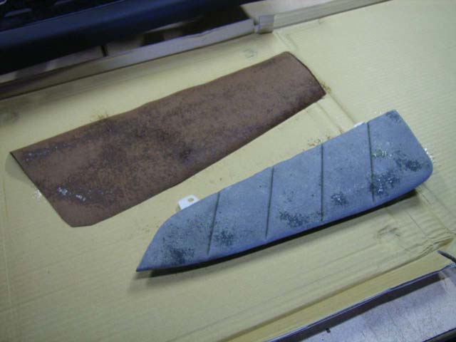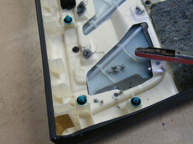 ドア内張りの裏から張替える部分が固定されている場所を探し圧着部分を削り取ります。