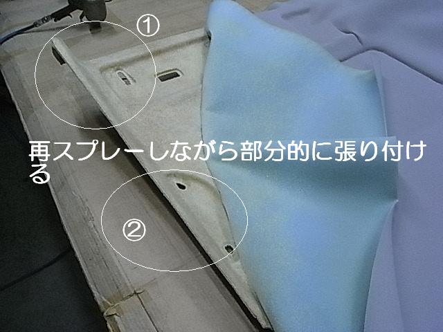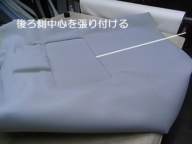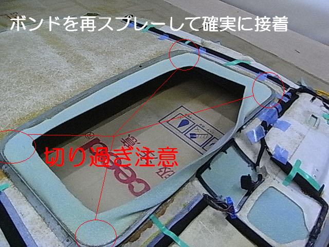 開口部の四隅を決めたら、後ろ側中心位置を確実に接着します、この場合ボンドの再スプレーは確実に行って下さい。