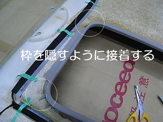 画像のように開口部枠が見えないように布地を接着して完了です、カットが大きいと四隅の枠が見えてしまいますのでご注意