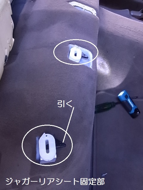 リアシート背面は画像に有る、バンドを強く引き背面裏側に有る、ロックを解除します、下側4箇所金具にはまっている為、上側に引き上げ、固定部を、抜きあげます。