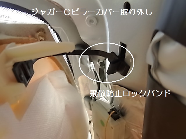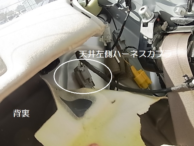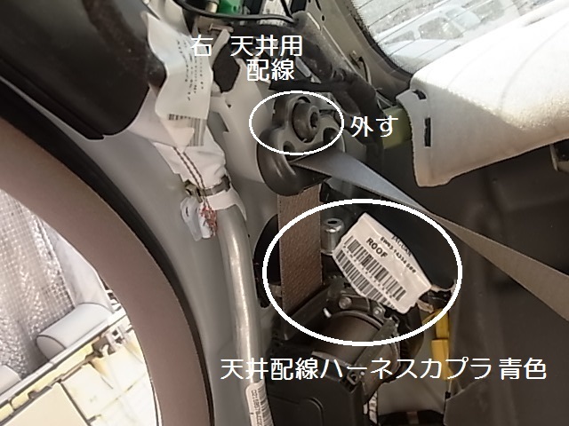 天井の後部ハーネスカプラはリアシートの裏にありますので後部Cピラーカバーを外し、シートベルト用ボルトを外します