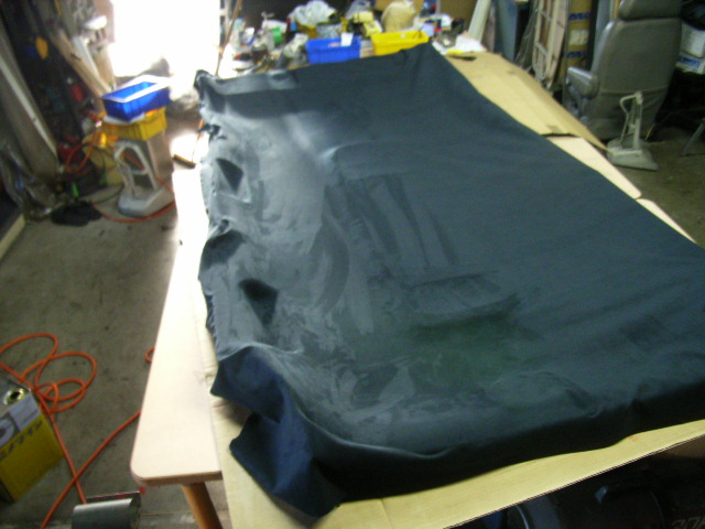 片側の中心部から前後に しわ を取りながら接着して行きますが、この場合もかなりボンドは乾燥していますので、張付ける部分、部分に再スプレーを行います、一