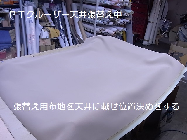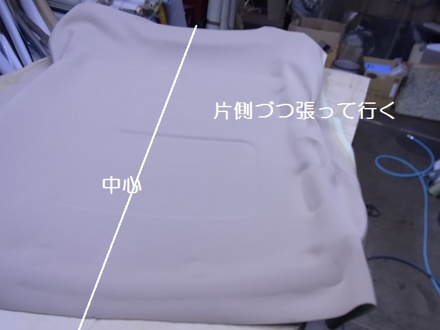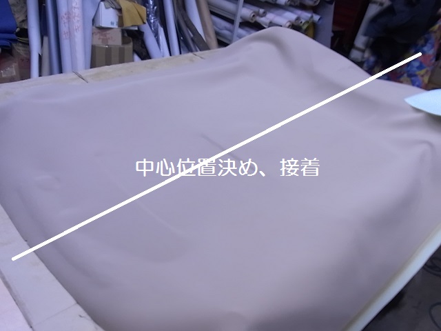 乾燥後、天井ボードに布地を乗せ、位置決めをします。