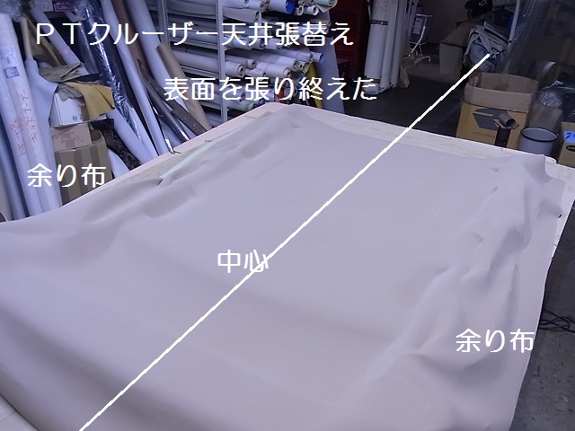 ボードより、だいぶ布地が余っているのがわかると思いますが、このぐらい布地が大きい方が、安心して作業を進める事が出来ます、天井の大きさで布地をカットすると、作業