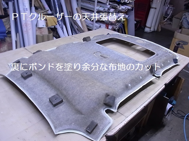 ボンドを塗り終わったら余分な布地をカットします、残す布地は約15ミリ〜20ミリ、カットが終わったら、天井を表に戻し表面のシワを見ながら裏側に接着します、シワが寄ってる部分は、裏側に引っ張って張り付けるとシワは取れます