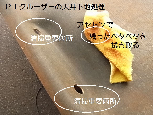 ブラシできれいに削り落としたら、今度はタオルにアセトンを染みこませ、特に凹凸部分は丁寧に残っている、ウレタンのカスを拭き除きます。
