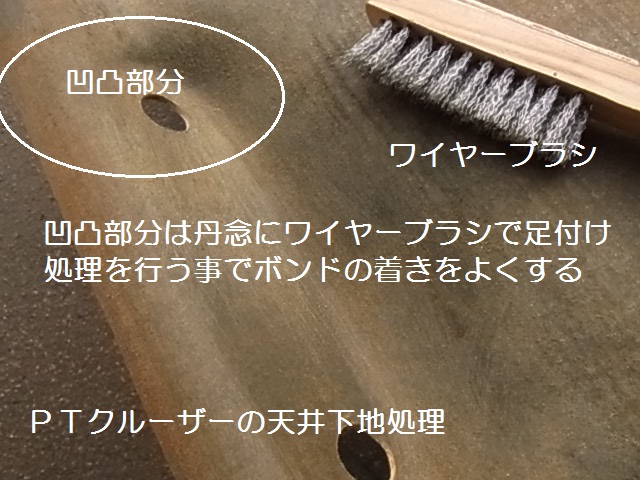 きれいに全体の残りカスを拭き除いたら、全体、特に凹凸部分をワイヤーブラシを、使用して、軽く足付け致します、足付けをする事により、ボンドの乗りを良くする効果があります