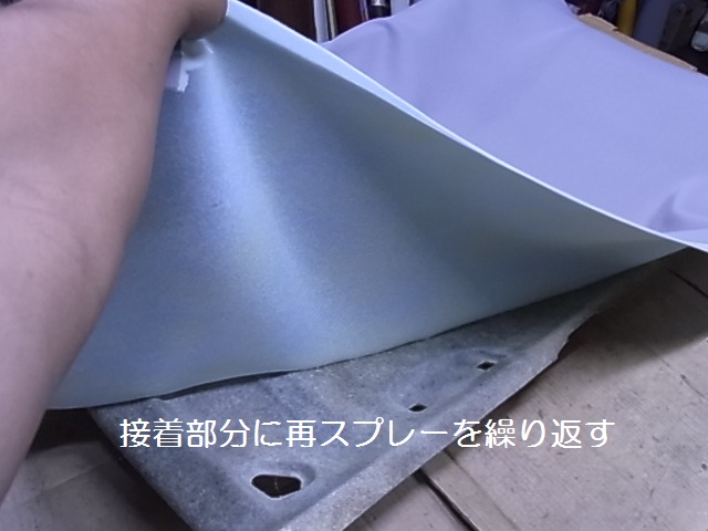 再スプレーは大きな面積には塗らず、張る部分、部分にボンドを塗る事が重要です、他の部分に塗ってしますと、布地が張り付いてしまい、剥がれなくなる場合があります。
