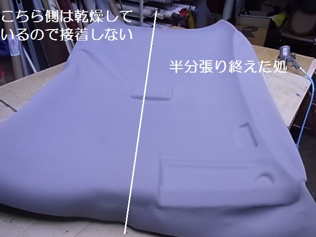 この天井の場合は左右に分けて張っていきますので最初に、左側の布地をめくり、ボンドを張り付ける部分に再スプレーを行います