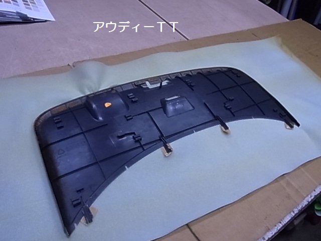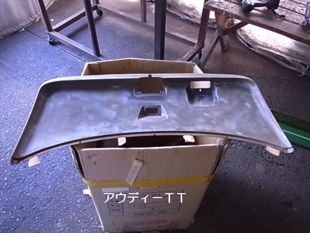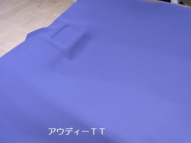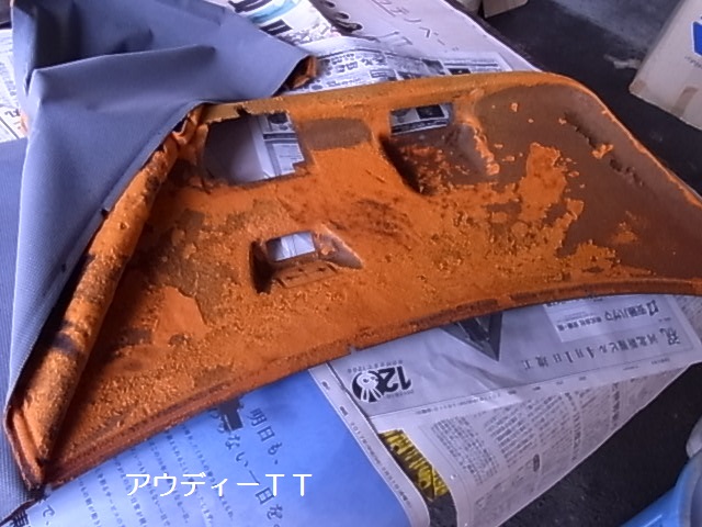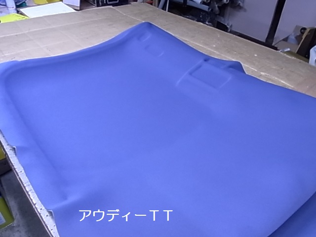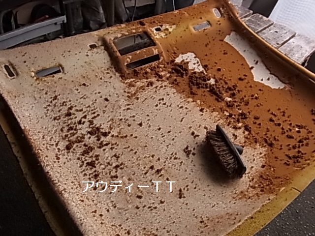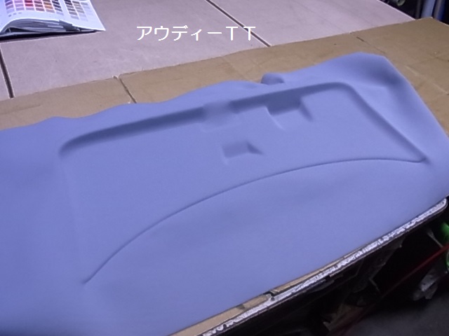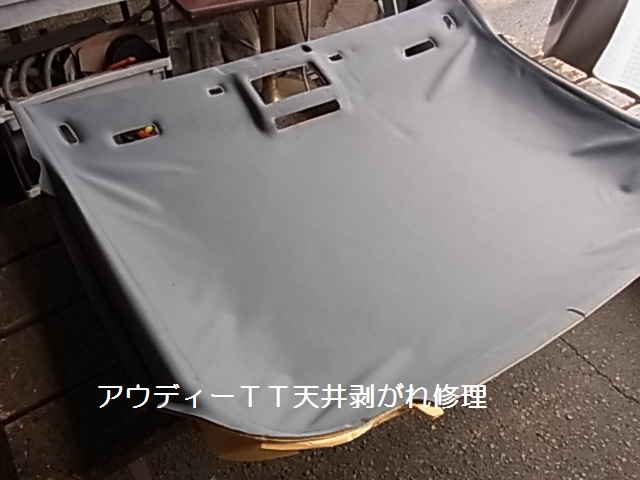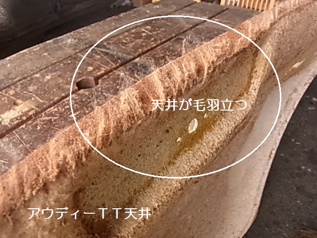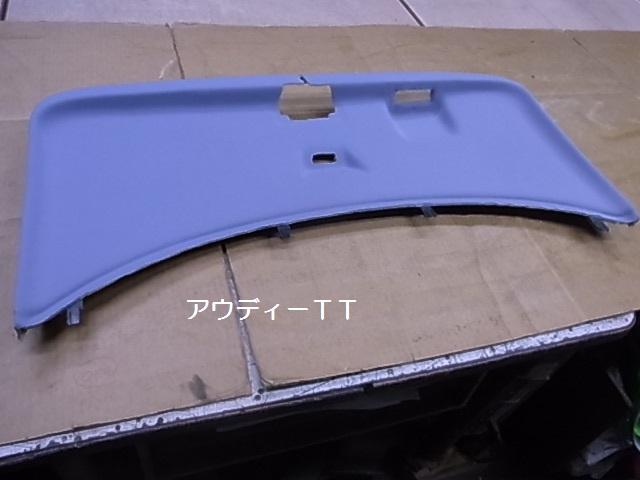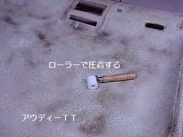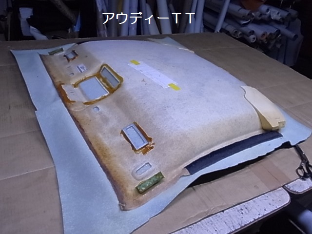 中心部分の凹凸部分から接着して行きますので、この部分に、再スプレーでボンドを塗ります、ライニング、天井、両方に下塗りをしていますので、接着用ボンドは薄く塗るだけで大丈夫です