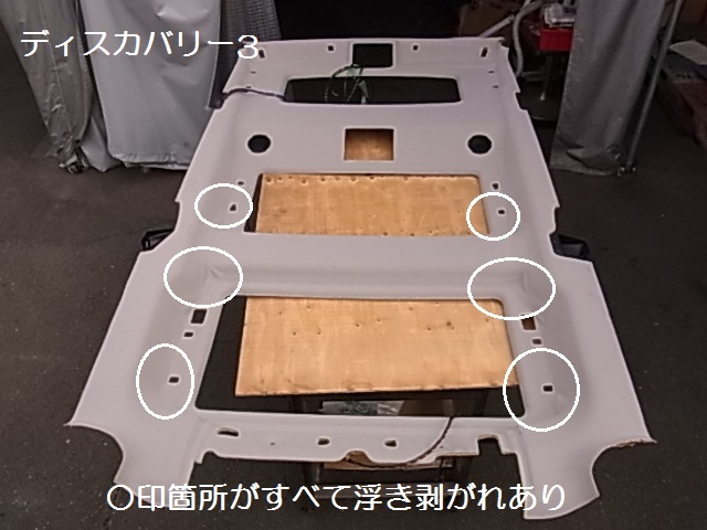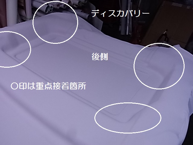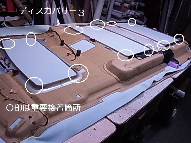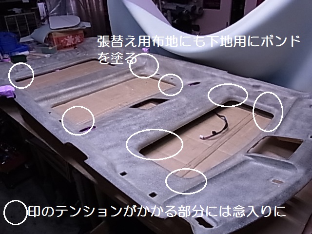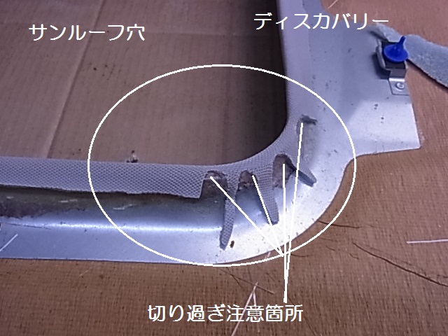 サンルーフ裏側はこのように接着が必要となりますので、布地を張る時点で、裏の接着方法も考えておく事が重要です |