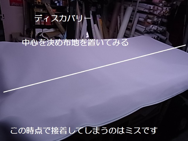 乾いて、ベタベタしなくなったらボードの上に置き、位置決めをします、この時点で布地が接着してしまうのは間違いです。