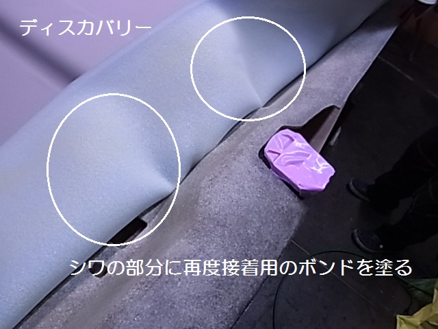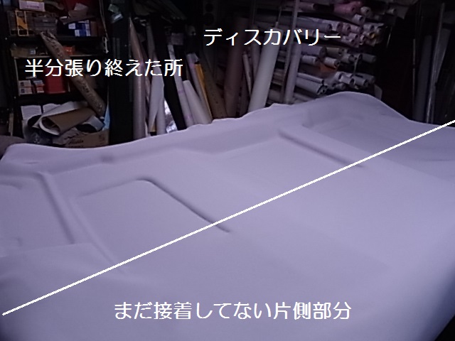 シワが出ますが、じっくりと、張る部分に、ボンドを再スプレーしながら張って行きます |