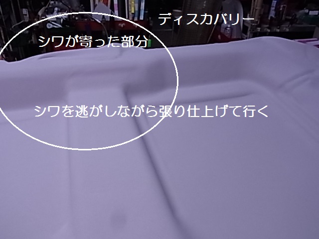 凹凸部分は低い部分を先に張り、徐々にシワを逃がしながら、上側に張って行くイメージです、いたるところに、
