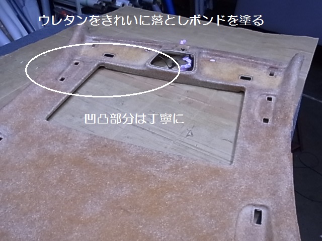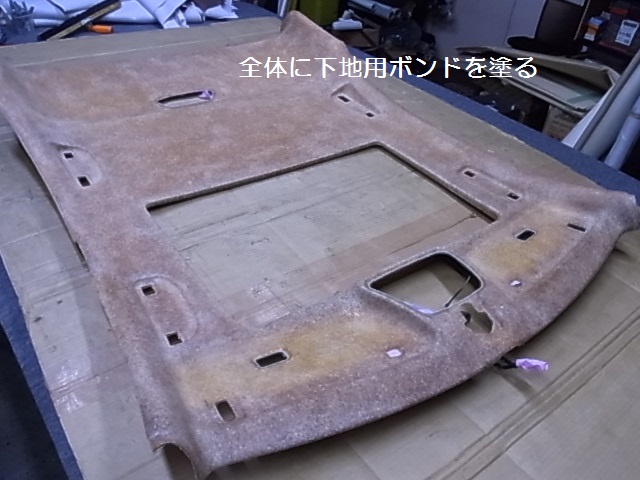 まず最初に下地用のボンドを塗ります、この年式の天井はかなり、粗めな作りですので、素材にかなり隙間がありますから、丁寧にボンドを下塗りして、十分に乾かします、一度下塗りを行っておくと、天井にボンドが染み込む事も無く、確実に接着出来ます。
