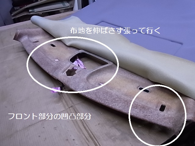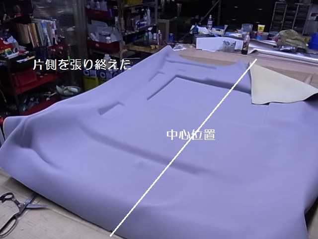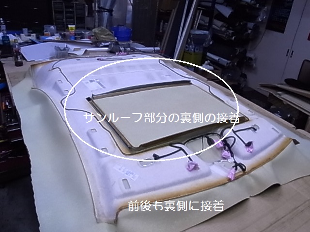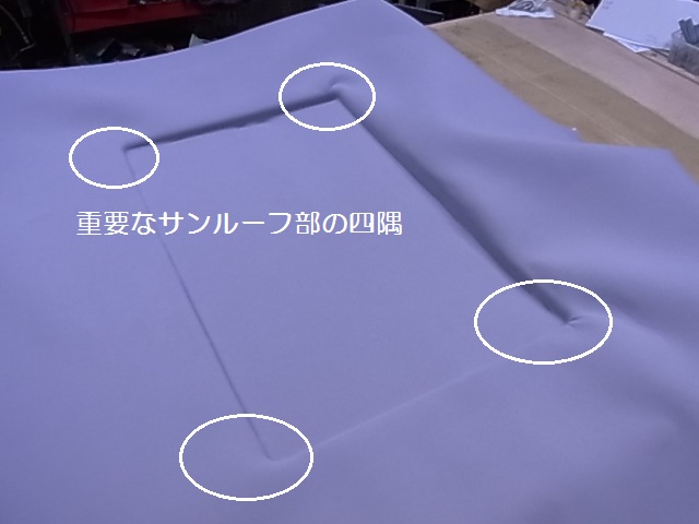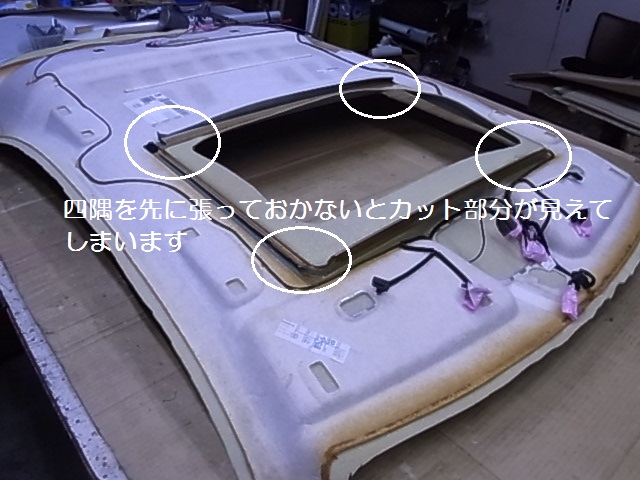 サンルーフの穴の部分の高さがある場合、最初にその部分を接着しておかないと、伸びの無い布地の場合、四隅の部分をきれいに張る事が出来ず、カット部分が見えてします場合がありますので要注意です