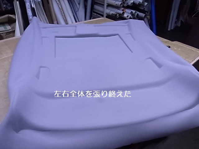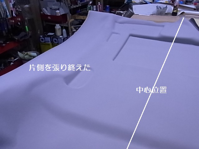 四隅を決めたら、次はフロント分の凹凸分を張って行きますが、必ずボンドの再スプレーを行い少しづつ張ってきます