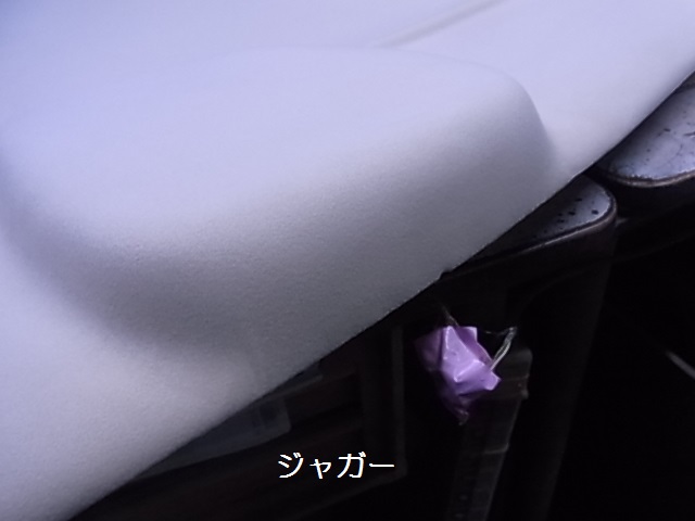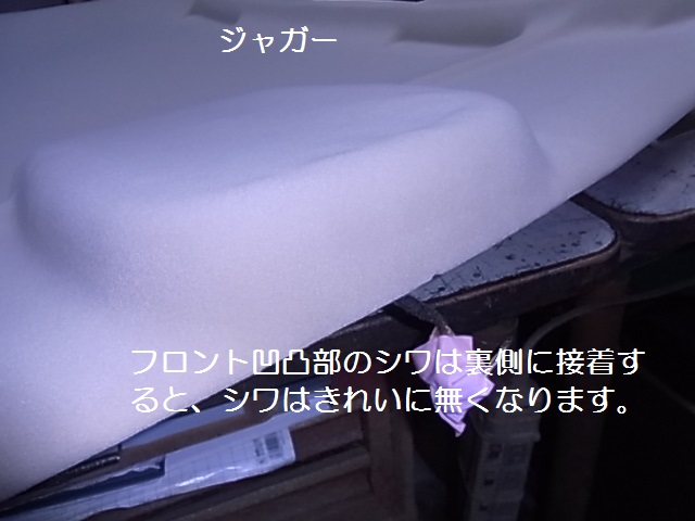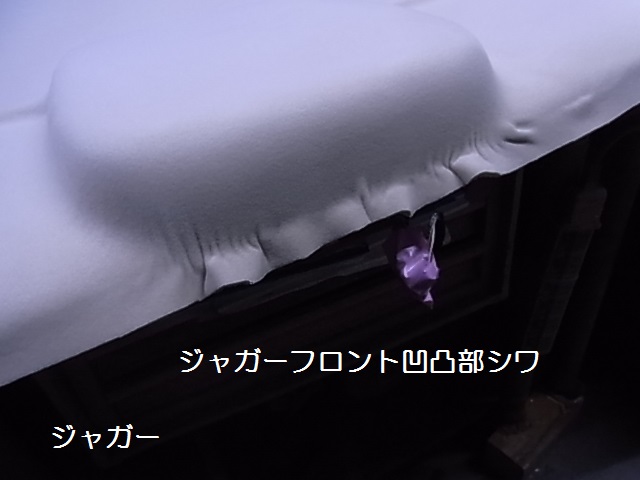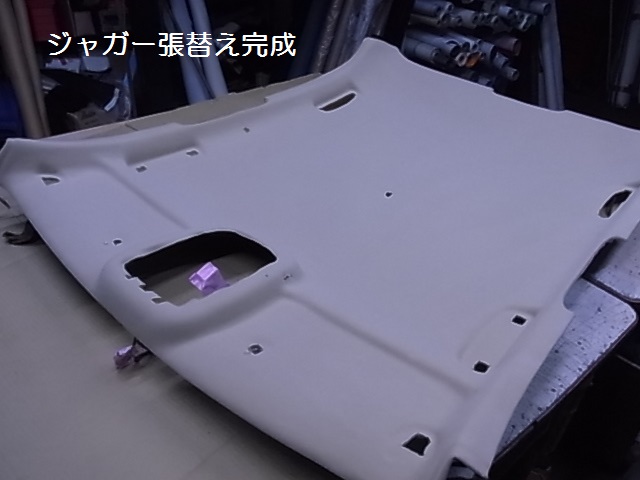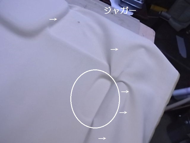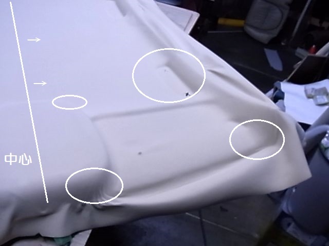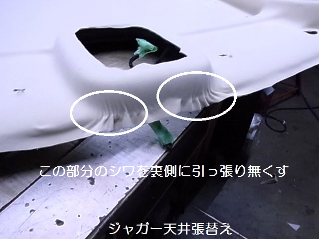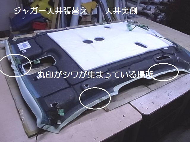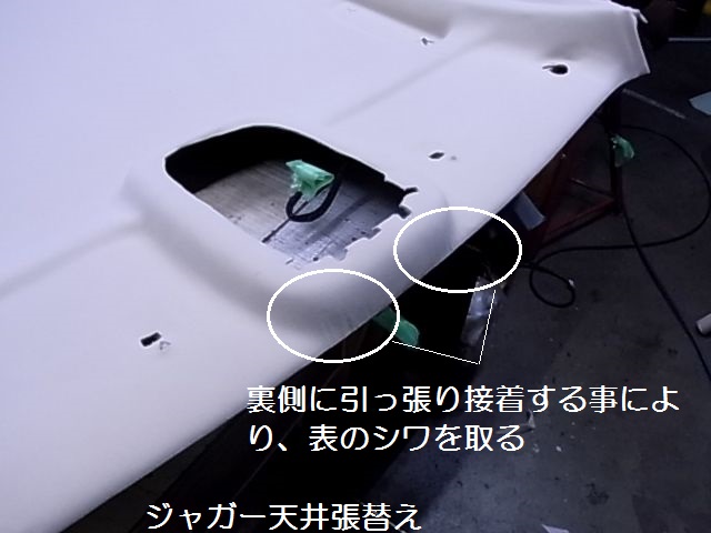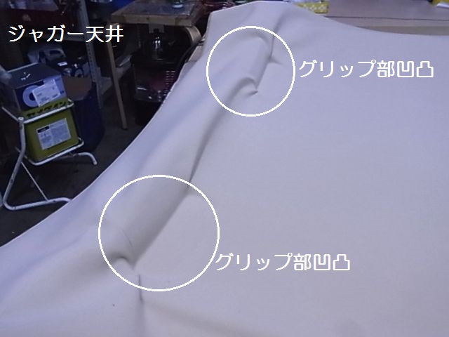 ジャガーの天井張替え時の大きな凹凸、小さな凹凸の張り方とシワの逃がし方の参考例です。