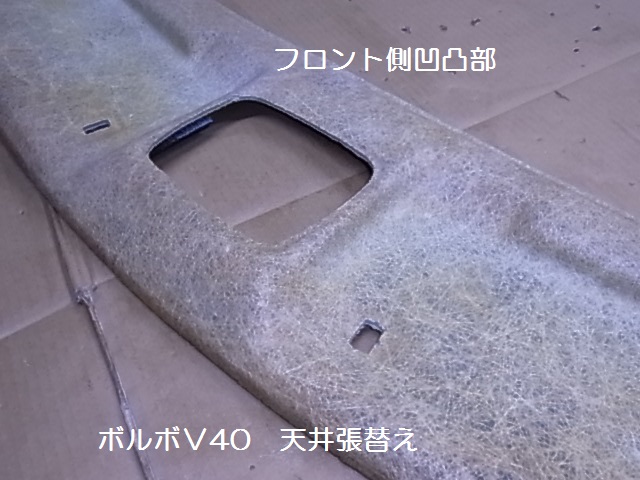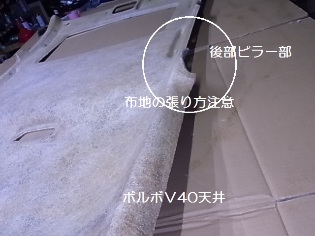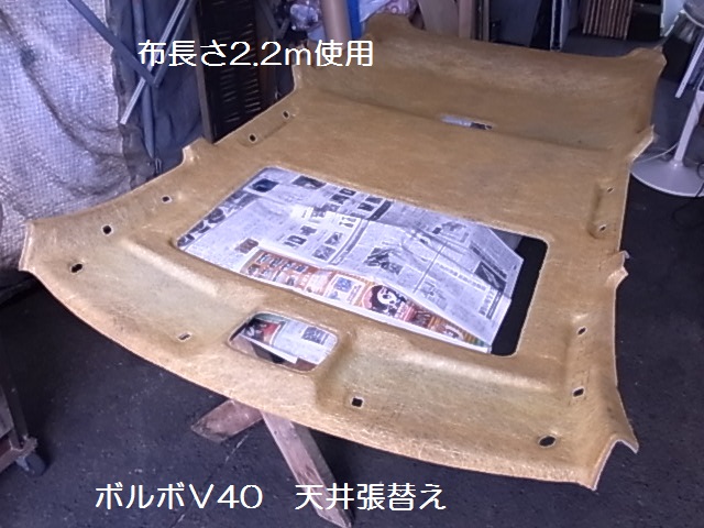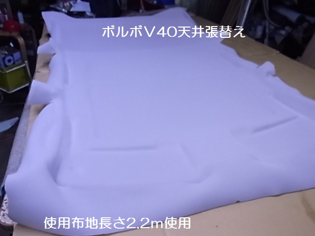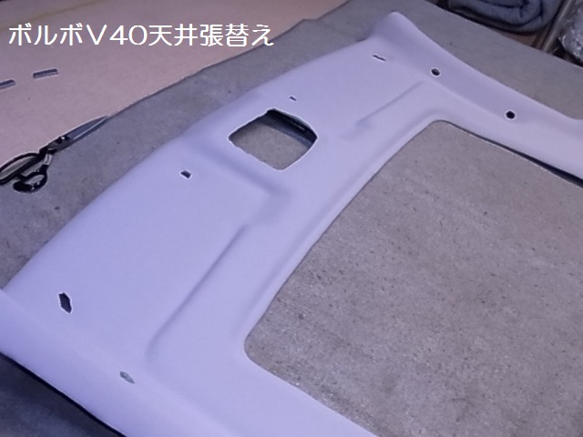ボルボV40 の天井張替えです、張替えに使用する布地は Dライトグレー 3ミリ厚を使用致しました。