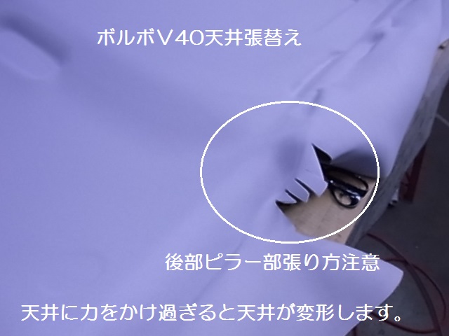 天井本体が硬さが有る場合は、このぐらいは気にしないで張ってもシワは逃げますが、ボルボはやわすぎるので力で張らずに