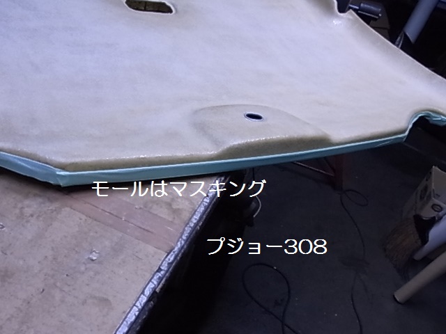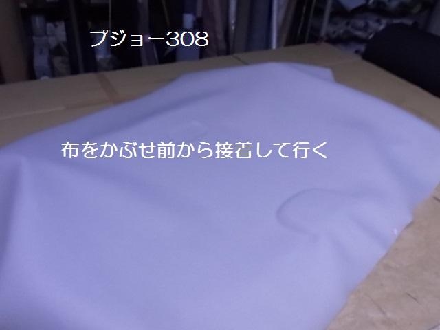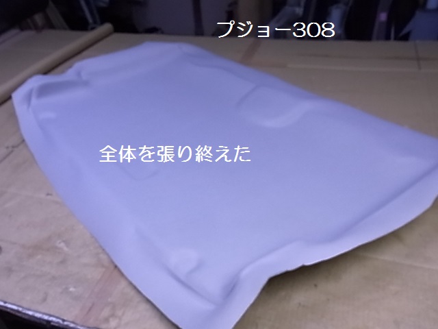プジョー308 の天井張替えです、張替えに使用する布地は Aライトグレー 3ミリ厚を使用致しました。